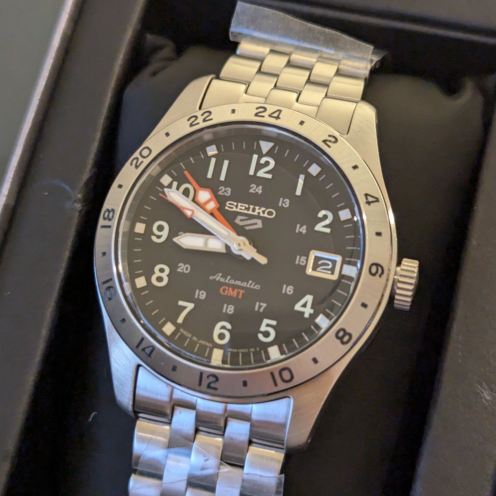 Seiko 5 Sports Field GMT. For decades, Seiko 5 Sports has delivered consistently high levels of reliability, durability, and performance. Equipped with automatic technology that you control with every movement, this versatile watch combines the clear and highly visible design elements of the Field style with the convenience of viewing the time in a second time zone. This timepiece is powered by a 24-jewel movement that beats at a frequency of 21,600 vibrations per hour, with a power reserve of approximately 41 hours and manual winding capability. Framed by a metalized silver GMT bezel, the black dial features bold luminous hands and markers, a date calendar, and a large red-orange GMT hand for instant visibility. A classic five-row stainless steel bracelet, with tri-fold push button release clasp and lock, adds rich texture and wearability, while the stainless steel case includes a screwdown see-through caseback for a view of classic timekeeping in action. 10 bar, 100M Water Resistant