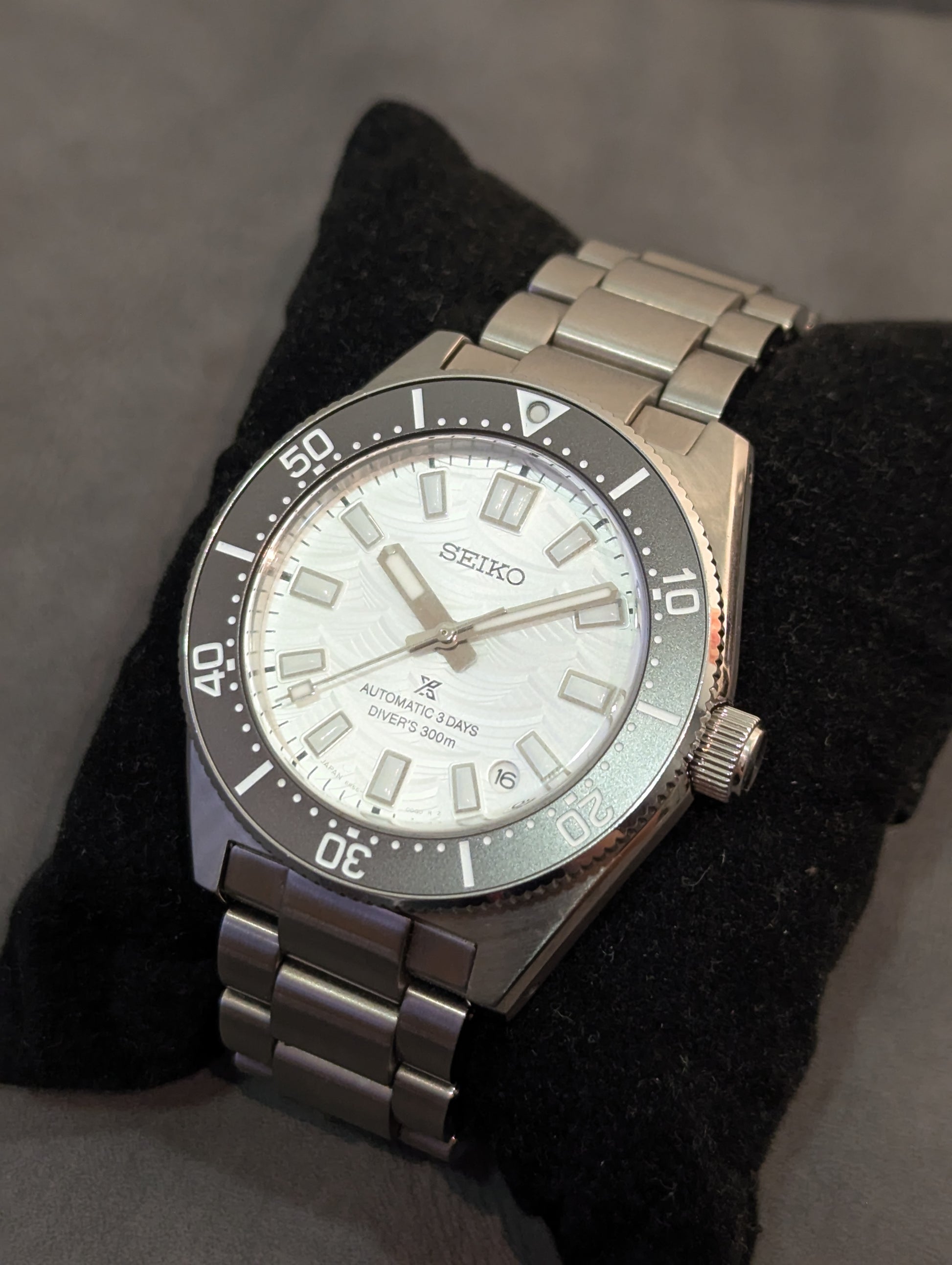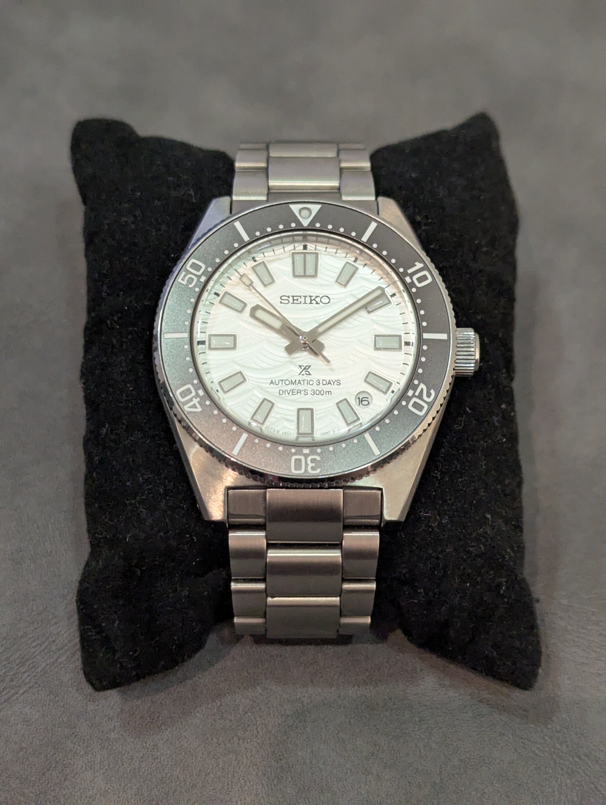 The eye-catching silver dial features a wave pattern evoking the wave symbol used for Seiko Diver's watches since the 1960s.