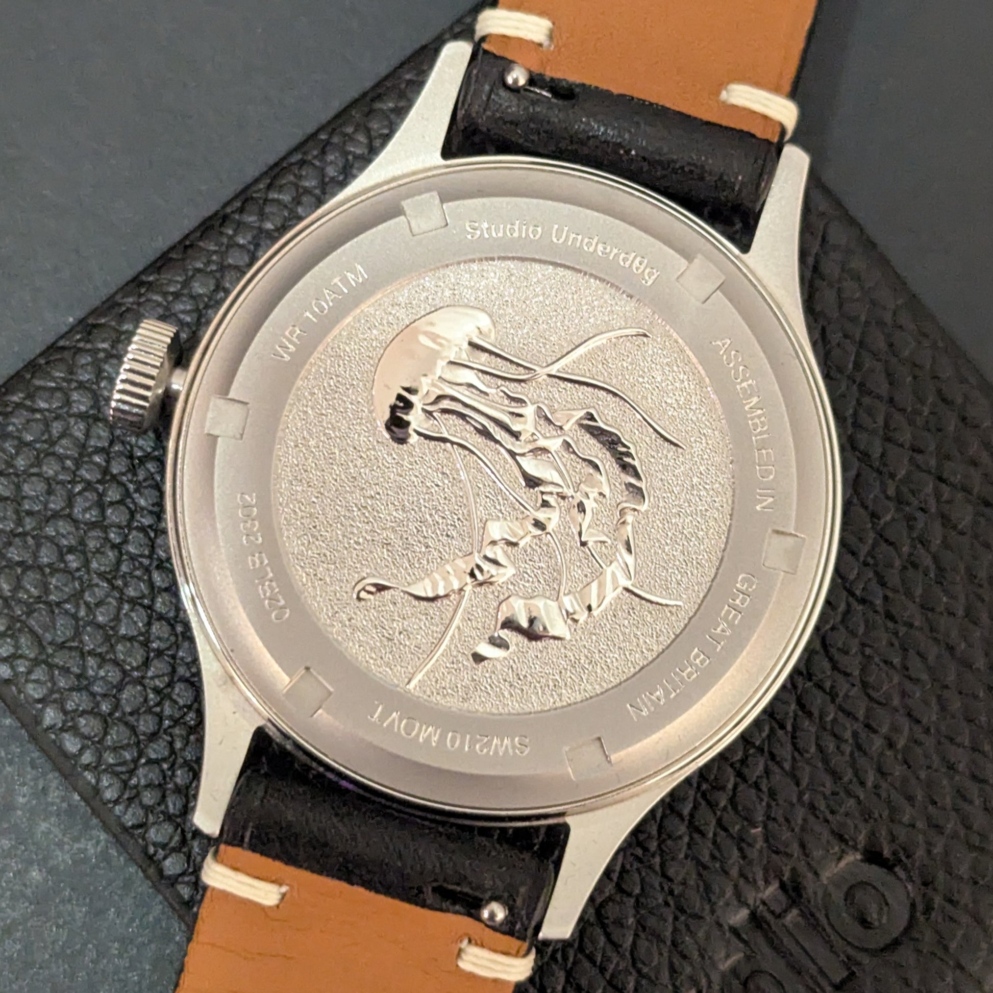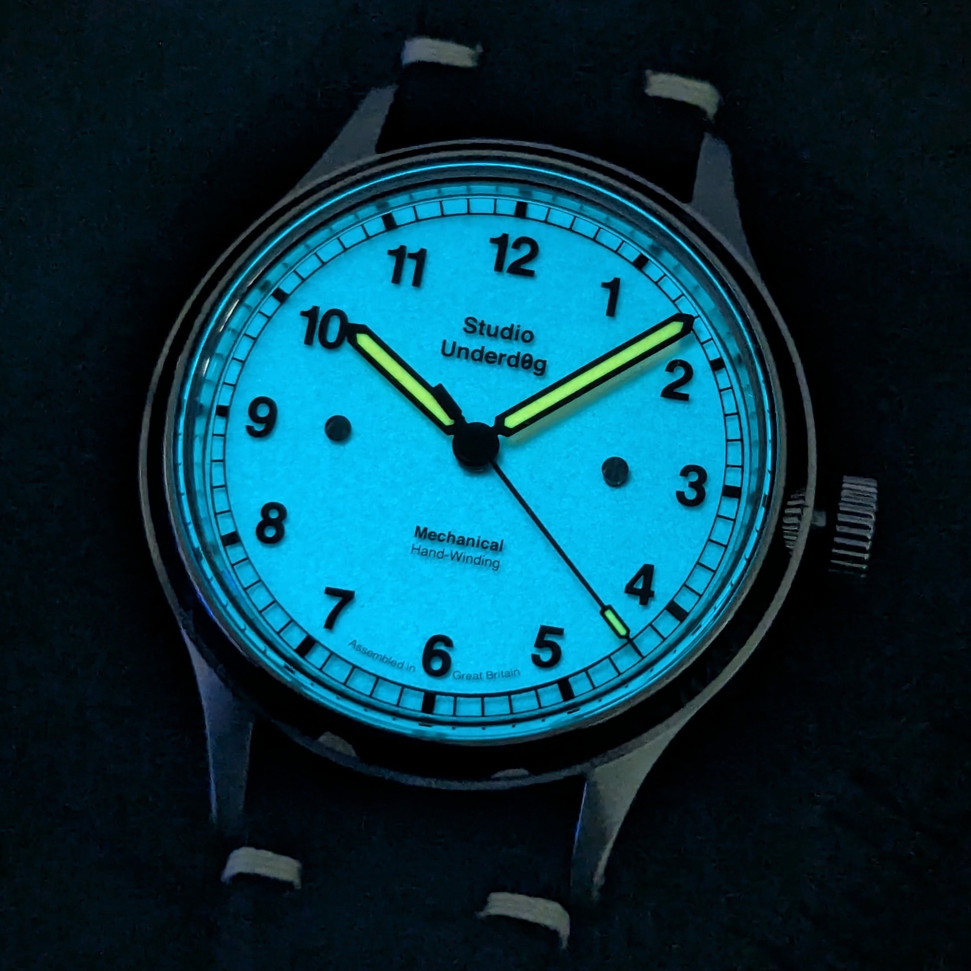 It wouldn’t be a Studio Underd0g watch without a playful twist. We’ve used current-day machining techniques and materials to create a sandwich dial like no other. The base dial features seven layers of custom-made Super-LumiNova pigment. Mounted on top of the base dial, is a 1mm sapphire disc, atop which the branding, minute track and Arabic numerals are printed. Once these two dials are affixed to one another via two slotted head pins, it creates a chunky dial with real depth.
